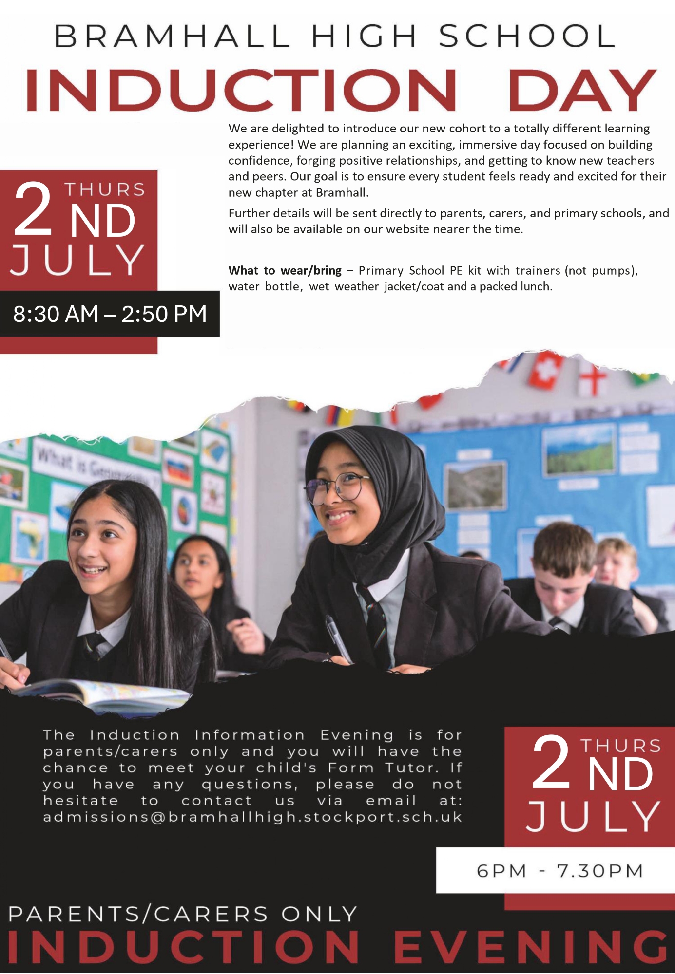 Transition from Primary School to Secondary School can be a stressful time for both students and parents/carers alike. Here at Bramhall High School we have a dedicated transition team to help smooth the way; Mrs A Conduit (Head of Year 7 - Sept 2026) and Ms C Lewis (SLT Lead on Transition).